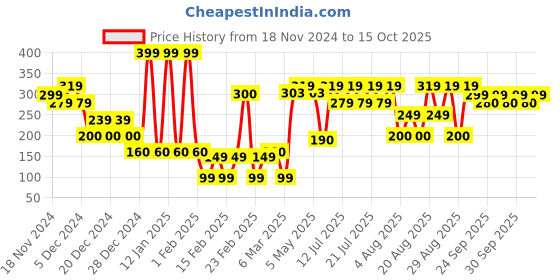 The current price is ₹299, which is ₹200 (202.0%) higher than the best price of ₹99 last seen on 3 Feb 2025. Over the 331 day price history period, prices have ranged from ₹99 to ₹399, with an average of ₹249. The pricing shows high volatility with significant fluctuations, with prices remaining relatively stable overall. In terms of recent activity, there have been 0 price changes this week, 5 this month, and 50 over the past year. If you need this product now, it's a reasonable time to buy as prices are stable, but you might want to monitor for potential better deals.