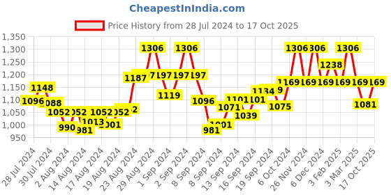 The current price is ₹1,169, which is ₹188 (19.2%) higher than the best price of ₹981 last seen on 14 Aug 2024. Over the 446 day price history period, prices have ranged from ₹981 to ₹1,306, with an average of ₹1,129. The pricing shows moderate volatility, but the overall trend is concerning as prices are getting more expensive. In terms of recent activity, there have been 0 price changes this week, 0 this month, and 9 over the past year. If you need this product now, it's a reasonable time to buy as prices are stable, but you might want to monitor for potential better deals.