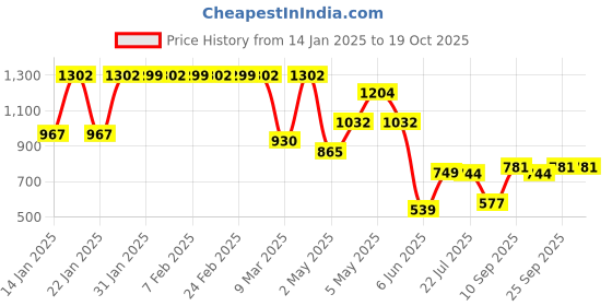 The current price is ₹781, which is ₹242 (44.9%) higher than the best price of ₹539 last seen on 6 Jun 2025. Over the 277 day price history period, prices have ranged from ₹539 to ₹1,302, with an average of ₹1,017. The pricing shows high volatility with significant fluctuations, and the overall trend is favorable for consumers as prices are getting cheaper. In terms of recent activity, there have been 0 price changes this week, 1 this month, and 22 over the past year. If you need this product now, it's a reasonable time to buy as prices are stable, but you might want to monitor for potential better deals.