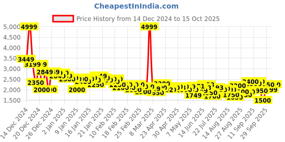 The current price is ₹2,250, which is ₹750 (50.0%) higher than the best price of ₹1,500 last seen on 26 Sep 2025. Over the 305 day price history period, prices have ranged from ₹1,500 to ₹4,999, with an average of ₹2,310. The pricing shows high volatility with significant fluctuations, and the overall trend is favorable for consumers as prices are getting cheaper. In terms of recent activity, there have been 0 price changes this week, 4 this month, and 78 over the past year. If you need this product now, it's a reasonable time to buy as prices are stable, but you might want to monitor for potential better deals.