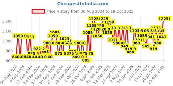 The current price is ₹1,225, which is ₹420 (52.2%) higher than the best price of ₹805 last seen on 26 Oct 2024. Over the 414 day price history period, prices have ranged from ₹805 to ₹1,225, with an average of ₹1,003. The pricing shows moderate volatility, but the overall trend is concerning as prices are getting more expensive. In terms of recent activity, there have been 0 price changes this week, 0 this month, and 41 over the past year. Consider waiting before making a purchase as prices are rising and better deals may be available later.