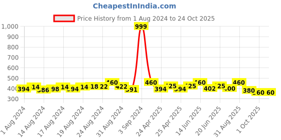 Good news! The current price of ₹360 is at its best ever level. Over the 449 day price history period, prices have ranged from ₹360 to ₹999, with an average of ₹434. The pricing shows high volatility with significant fluctuations, and the overall trend is favorable for consumers as prices are getting cheaper. In terms of recent activity, there have been 0 price changes this week, 0 this month, and 11 over the past year. If you need this product now, it's a reasonable time to buy as prices are stable, but you might want to monitor for potential better deals.