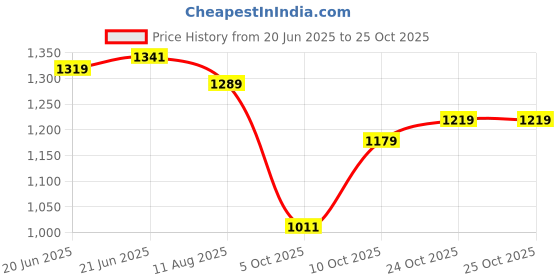 The current price is ₹1,219, which is ₹208 (20.6%) higher than the best price of ₹1,011 last seen on 5 Oct 2025. Over the 126 day price history period, prices have ranged from ₹1,011 to ₹1,341, with an average of ₹1,225. The pricing shows moderate volatility, and the overall trend is favorable for consumers as prices are getting cheaper. In terms of recent activity, there have been 0 price changes this week, 2 this month, and 5 over the past year. If you need this product now, it's a reasonable time to buy as prices are stable, but you might want to monitor for potential better deals.