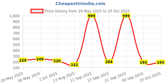 The current price is ₹193, which is ₹41 (27.0%) higher than the best price of ₹152 last seen on 13 Aug 2025. Over the 148 day price history period, prices have ranged from ₹152 to ₹999, with an average of ₹382. The pricing shows high volatility with significant fluctuations, and the overall trend is favorable for consumers as prices are getting cheaper. In terms of recent activity, there have been 0 price changes this week, 0 this month, and 7 over the past year. This is an excellent time to make a purchase as prices are trending downward and conditions appear favorable.