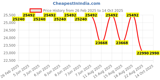 Fantastic! The current price of ₹22,990 is at its best ever level. Over the 229 day price history period, prices have ranged from ₹22,990 to ₹25,492, with an average of ₹24,802. The pricing has been quite stable with low volatility, and the overall trend is favorable for consumers as prices are getting cheaper. In terms of recent activity, there have been 0 price changes this week, 0 this month, and 12 over the past year. This is an excellent time to make a purchase as prices are trending downward and conditions appear favorable.