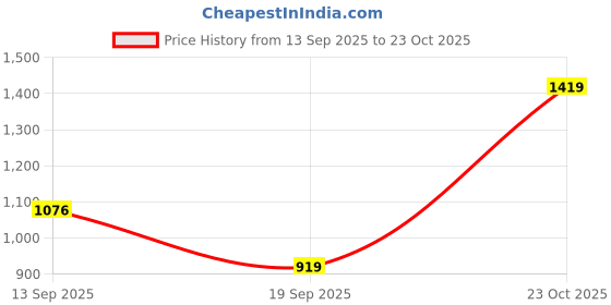 The current price is ₹1,419, which is ₹500 (54.4%) higher than the best price of ₹919 last seen on 19 Sep 2025. Over the 40 day price history period, prices have ranged from ₹919 to ₹1,419, with an average of ₹1,138. The pricing shows high volatility with significant fluctuations, but the overall trend is concerning as prices are getting more expensive. In terms of recent activity, there have been 0 price changes this week, 0 this month, and 2 over the past year. Consider waiting before making a purchase as prices are rising and better deals may be available later.