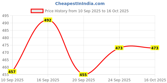 The current price is ₹473, which is ₹18 (4.0%) higher than the best price of ₹455 last seen on 20 Sep 2025. Over the 36 day price history period, prices have ranged from ₹455 to ₹492, with an average of ₹470. The pricing has been quite stable with low volatility, with prices remaining relatively stable overall. In terms of recent activity, there have been 0 price changes this week, 1 this month, and 3 over the past year. If you need this product now, it's a reasonable time to buy as prices are stable, but you might want to monitor for potential better deals.