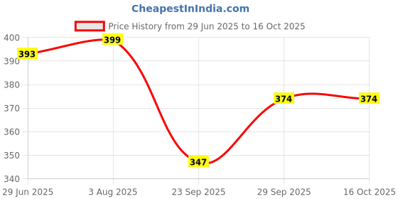 The current price is ₹374, which is ₹27 (7.8%) higher than the best price of ₹347 last seen on 23 Sep 2025. Over the 109 day price history period, prices have ranged from ₹347 to ₹399, with an average of ₹377. The pricing has been quite stable with low volatility, with prices remaining relatively stable overall. In terms of recent activity, there have been 0 price changes this week, 1 this month, and 3 over the past year. If you need this product now, it's a reasonable time to buy as prices are stable, but you might want to monitor for potential better deals.