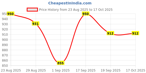 The current price is ₹912, which is ₹57 (6.7%) higher than the best price of ₹855 last seen on 1 Sep 2025. Over the 54 day price history period, prices have ranged from ₹855 to ₹950, with an average of ₹918. The pricing has been quite stable with low volatility, with prices remaining relatively stable overall. In terms of recent activity, there have been 0 price changes this week, 1 this month, and 4 over the past year. If you need this product now, it's a reasonable time to buy as prices are stable, but you might want to monitor for potential better deals.