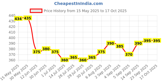 The current price is ₹395, which is ₹35 (9.7%) higher than the best price of ₹360 last seen on 14 Jul 2025. Over the 154 day price history period, prices have ranged from ₹360 to ₹435, with an average of ₹384. The pricing shows moderate volatility, and the overall trend is favorable for consumers as prices are getting cheaper. In terms of recent activity, there have been 0 price changes this week, 0 this month, and 14 over the past year. If you need this product now, it's a reasonable time to buy as prices are stable, but you might want to monitor for potential better deals.