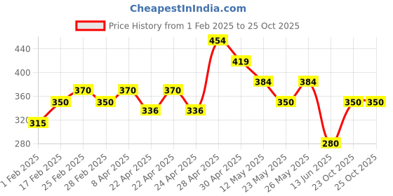 The current price is ₹350, which is ₹70 (25.0%) higher than the best price of ₹280 last seen on 13 Jun 2025. Over the 265 day price history period, prices have ranged from ₹280 to ₹454, with an average of ₹361. The pricing shows moderate volatility, but the overall trend is concerning as prices are getting more expensive. In terms of recent activity, there have been 0 price changes this week, 0 this month, and 14 over the past year. If you need this product now, it's a reasonable time to buy as prices are stable, but you might want to monitor for potential better deals.