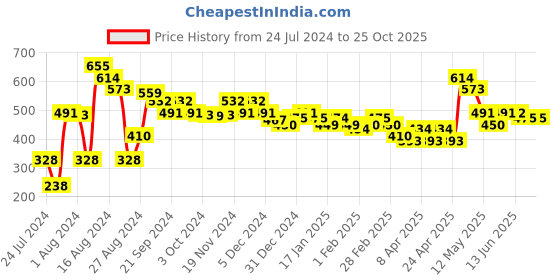 The current price is ₹475, which is ₹237 (99.6%) higher than the best price of ₹238 last seen on 28 Jul 2024. Over the 457 day price history period, prices have ranged from ₹238 to ₹655, with an average of ₹471. The pricing shows high volatility with significant fluctuations, but the overall trend is concerning as prices are getting more expensive. In terms of recent activity, there have been 0 price changes this week, 0 this month, and 30 over the past year. If you need this product now, it's a reasonable time to buy as prices are stable, but you might want to monitor for potential better deals.