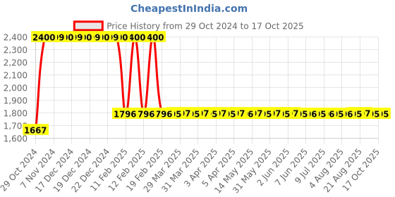 The current price is ₹1,795, which is ₹128 (7.7%) higher than the best price of ₹1,667 last seen on 29 Oct 2024. Over the 352 day price history period, prices have ranged from ₹1,667 to ₹2,400, with an average of ₹1,963. The pricing shows moderate volatility, but the overall trend is concerning as prices are getting more expensive. In terms of recent activity, there have been 0 price changes this week, 0 this month, and 37 over the past year. If you need this product now, it's a reasonable time to buy as prices are stable, but you might want to monitor for potential better deals.