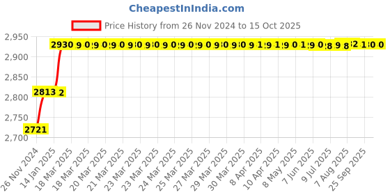 The current price is ₹2,930, which is ₹209 (7.7%) higher than the best price of ₹2,721 last seen on 26 Nov 2024. Over the 322 day price history period, prices have ranged from ₹2,721 to ₹2,932, with an average of ₹2,919. The pricing has been quite stable with low volatility, but the overall trend is concerning as prices are getting more expensive. In terms of recent activity, there have been 0 price changes this week, 0 this month, and 38 over the past year. If you need this product now, it's a reasonable time to buy as prices are stable, but you might want to monitor for potential better deals.