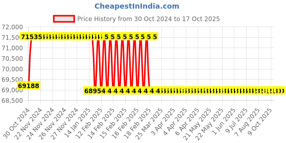 Great news for shoppers! The current price of ₹68,950 is at its best ever level. Over the 351 day price history period, prices have ranged from ₹68,950 to ₹71,535, with an average of ₹69,901. The pricing has been quite stable with low volatility, with prices remaining relatively stable overall. In terms of recent activity, there have been 0 price changes this week, 1 this month, and 80 over the past year. If you need this product now, it's a reasonable time to buy as prices are stable, but you might want to monitor for potential better deals.