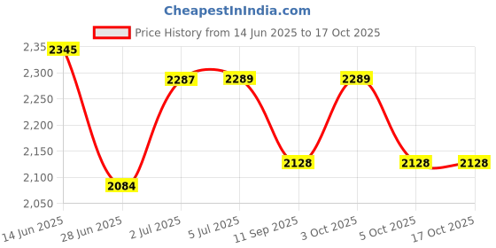 The current price is ₹2,128, which is ₹44 (2.1%) higher than the best price of ₹2,084 last seen on 28 Jun 2025. Over the 124 day price history period, prices have ranged from ₹2,084 to ₹2,345, with an average of ₹2,210. The pricing has been quite stable with low volatility, and the overall trend is favorable for consumers as prices are getting cheaper. In terms of recent activity, there have been 0 price changes this week, 1 this month, and 6 over the past year. This is an excellent time to make a purchase as prices are trending downward and conditions appear favorable.