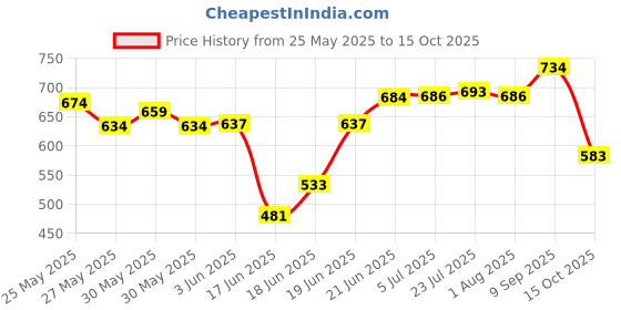 The current price is ₹583, which is ₹102 (21.2%) higher than the best price of ₹481 last seen on 17 Jun 2025. Over the 143 day price history period, prices have ranged from ₹481 to ₹734, with an average of ₹640. The pricing shows moderate volatility, and the overall trend is favorable for consumers as prices are getting cheaper. In terms of recent activity, there have been 0 price changes this week, 0 this month, and 13 over the past year. This is an excellent time to make a purchase as prices are trending downward and conditions appear favorable.