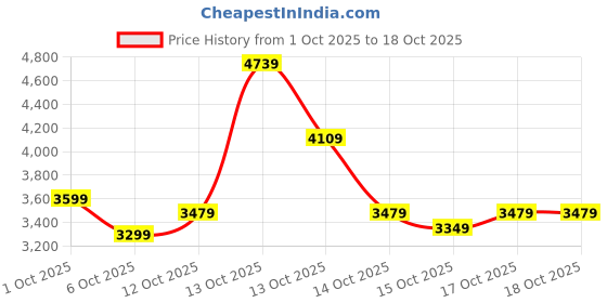 The current price is ₹3,479, which is ₹180 (5.5%) higher than the best price of ₹3,299 last seen on 6 Oct 2025. Over the 17 day price history period, prices have ranged from ₹3,299 to ₹4,739, with an average of ₹3,668. The pricing shows moderate volatility, with prices remaining relatively stable overall. In terms of recent activity, there have been 5 price changes this week, 7 this month, and 7 over the past year. The price direction is uncertain, so monitor the situation for a few more days before making a decision.