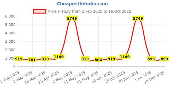 The current price is ₹899, which is ₹118 (15.1%) higher than the best price of ₹781 last seen on 2 Mar 2025. Over the 256 day price history period, prices have ranged from ₹781 to ₹5,749, with an average of ₹1,738. The pricing shows high volatility with significant fluctuations, with prices remaining relatively stable overall. In terms of recent activity, there have been 0 price changes this week, 0 this month, and 10 over the past year. The price direction is uncertain, so monitor the situation for a few more days before making a decision.