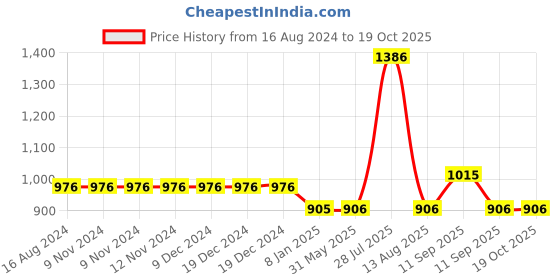 The current price is ₹906, which is ₹0.24 (0.0%) higher than the best price of ₹905.76 last seen on 8 Jan 2025. Over the 429 day price history period, prices have ranged from ₹905.76 to ₹1,386, with an average of ₹983. The pricing shows moderate volatility, and the overall trend is favorable for consumers as prices are getting cheaper. In terms of recent activity, there have been 0 price changes this week, 0 this month, and 11 over the past year. This is an excellent time to make a purchase as prices are trending downward and conditions appear favorable.