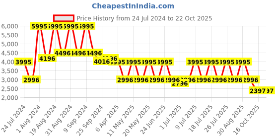 Fantastic! The current price of ₹2,397 is at its best ever level. Over the 454 day price history period, prices have ranged from ₹2,397 to ₹5,995, with an average of ₹3,856. The pricing shows high volatility with significant fluctuations, and the overall trend is favorable for consumers as prices are getting cheaper. In terms of recent activity, there have been 0 price changes this week, 0 this month, and 19 over the past year. This is an excellent time to make a purchase as prices are trending downward and conditions appear favorable.