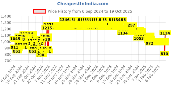 The current price is ₹1,134, which is ₹344 (43.5%) higher than the best price of ₹790 last seen on 26 Oct 2024. Over the 407 day price history period, prices have ranged from ₹790 to ₹1,346, with an average of ₹1,142. The pricing shows moderate volatility, but the overall trend is concerning as prices are getting more expensive. In terms of recent activity, there have been 0 price changes this week, 0 this month, and 297 over the past year. Consider waiting before making a purchase as prices are rising and better deals may be available later.