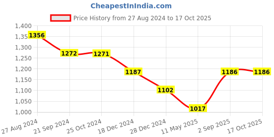 The current price is ₹1,186, which is ₹169 (16.6%) higher than the best price of ₹1,017 last seen on 11 May 2025. Over the 415 day price history period, prices have ranged from ₹1,017 to ₹1,356, with an average of ₹1,197. The pricing shows moderate volatility, and the overall trend is favorable for consumers as prices are getting cheaper. In terms of recent activity, there have been 0 price changes this week, 0 this month, and 4 over the past year. The price direction is uncertain, so monitor the situation for a few more days before making a decision.
