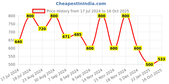 The current price is ₹533, which is ₹33 (6.6%) higher than the best price of ₹500 last seen on 22 Jan 2025. Over the 456 day price history period, prices have ranged from ₹500 to ₹800, with an average of ₹673. The pricing shows high volatility with significant fluctuations, and the overall trend is favorable for consumers as prices are getting cheaper. In terms of recent activity, there have been 0 price changes this week, 0 this month, and 5 over the past year. If you need this product now, it's a reasonable time to buy as prices are stable, but you might want to monitor for potential better deals.