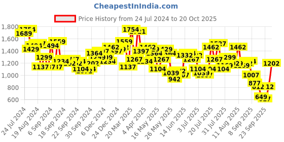 The current price is ₹1,202, which is ₹585 (94.8%) higher than the best price of ₹617 last seen on 23 Sep 2025. Over the 453 day price history period, prices have ranged from ₹617 to ₹1,754, with an average of ₹1,257. The pricing shows high volatility with significant fluctuations, and the overall trend is favorable for consumers as prices are getting cheaper. In terms of recent activity, there have been 0 price changes this week, 2 this month, and 53 over the past year. The price direction is uncertain, so monitor the situation for a few more days before making a decision.