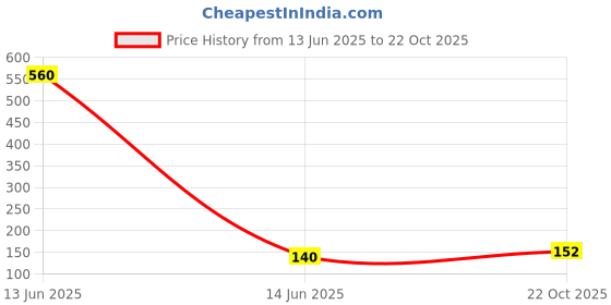 The current price is ₹152, which is ₹12 (8.6%) higher than the best price of ₹140 last seen on 14 Jun 2025. Over the 131 day price history period, prices have ranged from ₹140 to ₹560, with an average of ₹284. The pricing shows high volatility with significant fluctuations, and the overall trend is favorable for consumers as prices are getting cheaper. In terms of recent activity, there have been 0 price changes this week, 0 this month, and 2 over the past year. This is an excellent time to make a purchase as prices are trending downward and conditions appear favorable.