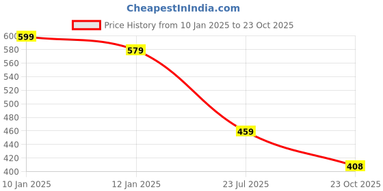 Exciting update! The current price of ₹408 is at its best ever level. Over the 286 day price history period, prices have ranged from ₹408 to ₹599, with an average of ₹511. The pricing shows high volatility with significant fluctuations, and the overall trend is favorable for consumers as prices are getting cheaper. In terms of recent activity, there have been 0 price changes this week, 0 this month, and 3 over the past year. This is an excellent time to make a purchase as prices are trending downward and conditions appear favorable.