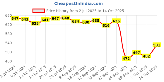 The current price is ₹531, which is ₹59 (12.5%) higher than the best price of ₹472 last seen on 24 Sep 2025. Over the 104 day price history period, prices have ranged from ₹472 to ₹648, with an average of ₹599. The pricing shows moderate volatility, and the overall trend is favorable for consumers as prices are getting cheaper. In terms of recent activity, there have been 0 price changes this week, 5 this month, and 14 over the past year. If you need this product now, it's a reasonable time to buy as prices are stable, but you might want to monitor for potential better deals.