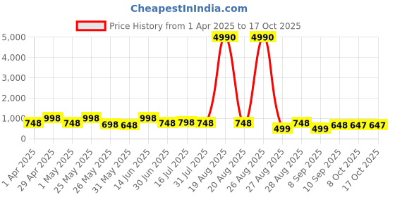 The current price is ₹647, which is ₹148 (29.7%) higher than the best price of ₹499 last seen on 27 Aug 2025. Over the 198 day price history period, prices have ranged from ₹499 to ₹4,990, with an average of ₹1,187. The pricing shows high volatility with significant fluctuations, and the overall trend is favorable for consumers as prices are getting cheaper. In terms of recent activity, there have been 0 price changes this week, 0 this month, and 17 over the past year. If you need this product now, it's a reasonable time to buy as prices are stable, but you might want to monitor for potential better deals.