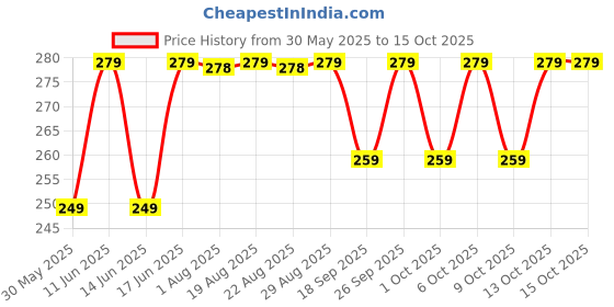 The current price is ₹279, which is ₹30 (12.0%) higher than the best price of ₹249 last seen on 30 May 2025. Over the 137 day price history period, prices have ranged from ₹249 to ₹279, with an average of ₹271. The pricing has been quite stable with low volatility, but the overall trend is concerning as prices are getting more expensive. In terms of recent activity, there has been 1 price change this week, 5 this month, and 13 over the past year. If you need this product now, it's a reasonable time to buy as prices are stable, but you might want to monitor for potential better deals.