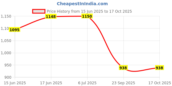 Awesome! The current price of ₹938 is at its best ever level. Over the 123 day price history period, prices have ranged from ₹938 to ₹1,150, with an average of ₹1,054. The pricing shows moderate volatility, and the overall trend is favorable for consumers as prices are getting cheaper. In terms of recent activity, there have been 0 price changes this week, 0 this month, and 3 over the past year. This is an excellent time to make a purchase as prices are trending downward and conditions appear favorable.