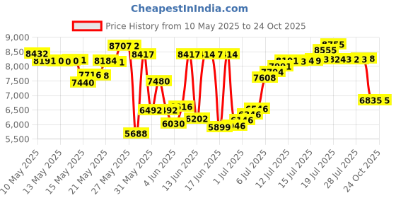The current price is ₹6,835, which is ₹1,147 (20.2%) higher than the best price of ₹5,688 last seen on 28 May 2025. Over the 167 day price history period, prices have ranged from ₹5,688 to ₹8,755, with an average of ₹7,659. The pricing shows moderate volatility, and the overall trend is favorable for consumers as prices are getting cheaper. In terms of recent activity, there have been 0 price changes this week, 0 this month, and 44 over the past year. This is an excellent time to make a purchase as prices are trending downward and conditions appear favorable.