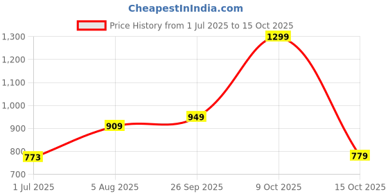 The current price is ₹1,299, which is ₹526 (68.0%) higher than the best price of ₹773 last seen on 1 Jul 2025. Over the 105 day price history period, prices have ranged from ₹773 to ₹1,299, with an average of ₹1,046. The pricing shows high volatility with significant fluctuations, but the overall trend is concerning as prices are getting more expensive. In terms of recent activity, there have been 0 price changes this week, 1 this month, and 3 over the past year. Consider waiting before making a purchase as prices are rising and better deals may be available later.