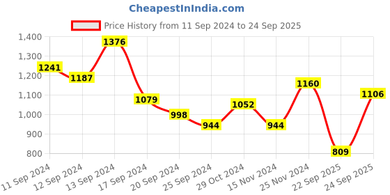 The current price is ₹1,106, which is ₹297 (36.7%) higher than the best price of ₹809 last seen on 22 Sep 2025. Over the 378 day price history period, prices have ranged from ₹809 to ₹1,376, with an average of ₹1,081. The pricing shows moderate volatility, and the overall trend is favorable for consumers as prices are getting cheaper. In terms of recent activity, there have been 0 price changes this week, 0 this month, and 4 over the past year. If you need this product now, it's a reasonable time to buy as prices are stable, but you might want to monitor for potential better deals.
