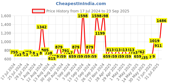 The current price is ₹1,486, which is ₹871 (141.6%) higher than the best price of ₹615 last seen on 14 Aug 2024. Over the 433 day price history period, prices have ranged from ₹615 to ₹1,598, with an average of ₹838. The pricing shows high volatility with significant fluctuations, but the overall trend is concerning as prices are getting more expensive. In terms of recent activity, there have been 0 price changes this week, 0 this month, and 17 over the past year. Consider waiting before making a purchase as prices are rising and better deals may be available later.