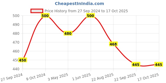 Exciting update! The current price of ₹445 is at its best ever level. Over the 384 day price history period, prices have ranged from ₹445 to ₹500, with an average of ₹470. The pricing has been quite stable with low volatility, with prices remaining relatively stable overall. In terms of recent activity, there have been 0 price changes this week, 0 this month, and 3 over the past year. If you need this product now, it's a reasonable time to buy as prices are stable, but you might want to monitor for potential better deals.