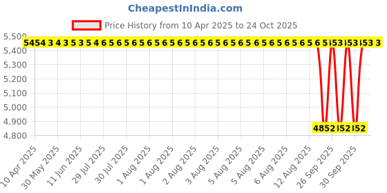 The current price is ₹5,453, which is ₹601 (12.4%) higher than the best price of ₹4,852 last seen on 24 Sep 2025. Over the 197 day price history period, prices have ranged from ₹4,852 to ₹5,456, with an average of ₹5,415. The pricing has been quite stable with low volatility, with prices remaining relatively stable overall. In terms of recent activity, there have been 0 price changes this week, 4 this month, and 43 over the past year. The price direction is uncertain, so monitor the situation for a few more days before making a decision.