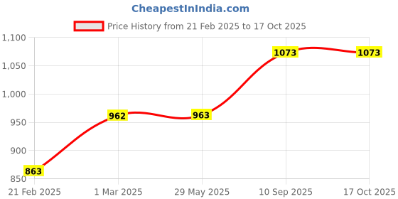 The current price is ₹1,073, which is ₹209.01 (24.2%) higher than the best price of ₹863.99 last seen on 21 Feb 2025. Over the 237 day price history period, prices have ranged from ₹863.99 to ₹1,073, with an average of ₹987. The pricing shows moderate volatility, but the overall trend is concerning as prices are getting more expensive. In terms of recent activity, there have been 0 price changes this week, 0 this month, and 3 over the past year. Consider waiting before making a purchase as prices are rising and better deals may be available later.