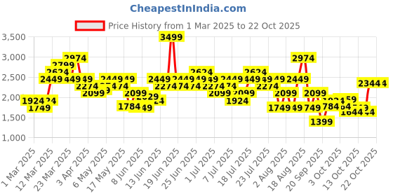 The current price is ₹2,344, which is ₹945 (67.5%) higher than the best price of ₹1,399 last seen on 20 Sep 2025. Over the 234 day price history period, prices have ranged from ₹1,399 to ₹3,499, with an average of ₹2,213. The pricing shows high volatility with significant fluctuations, but the overall trend is concerning as prices are getting more expensive. In terms of recent activity, there has been 1 price change this week, 7 this month, and 56 over the past year. Consider waiting before making a purchase as prices are rising and better deals may be available later.