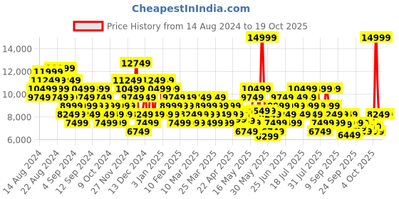 The current price is ₹8,249, which is ₹1,950 (31.0%) higher than the best price of ₹6,299 last seen on 30 May 2025. Over the 430 day price history period, prices have ranged from ₹6,299 to ₹14,999, with an average of ₹8,872. The pricing shows high volatility with significant fluctuations, and the overall trend is favorable for consumers as prices are getting cheaper. In terms of recent activity, there have been 0 price changes this week, 10 this month, and 91 over the past year. This is an excellent time to make a purchase as prices are trending downward and conditions appear favorable.