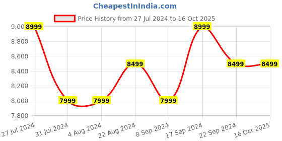 The current price is ₹8,499, which is ₹500 (6.3%) higher than the best price of ₹7,999 last seen on 4 Aug 2024. Over the 446 day price history period, prices have ranged from ₹7,999 to ₹8,999, with an average of ₹8,437. The pricing has been quite stable with low volatility, and the overall trend is favorable for consumers as prices are getting cheaper. In terms of recent activity, there have been 0 price changes this week, 0 this month, and 0 over the past year. This is an excellent time to make a purchase as prices are trending downward and conditions appear favorable.