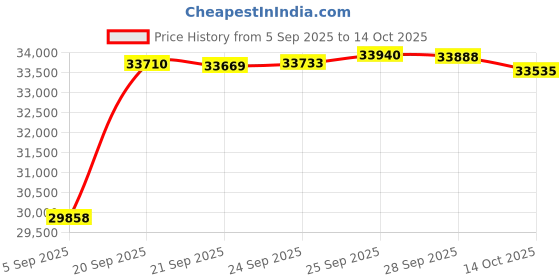 The current price is ₹33,535, which is ₹3,677 (12.3%) higher than the best price of ₹29,858 last seen on 5 Sep 2025. Over the 39 day price history period, prices have ranged from ₹29,858 to ₹33,940, with an average of ₹33,190. The pricing has been quite stable with low volatility, but the overall trend is concerning as prices are getting more expensive. In terms of recent activity, there have been 0 price changes this week, 5 this month, and 6 over the past year. The price direction is uncertain, so monitor the situation for a few more days before making a decision.