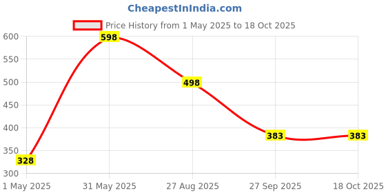 The current price is ₹383, which is ₹55 (16.8%) higher than the best price of ₹328 last seen on 1 May 2025. Over the 170 day price history period, prices have ranged from ₹328 to ₹598, with an average of ₹438. The pricing shows high volatility with significant fluctuations, but the overall trend is concerning as prices are getting more expensive. In terms of recent activity, there have been 0 price changes this week, 0 this month, and 3 over the past year. The price direction is uncertain, so monitor the situation for a few more days before making a decision.