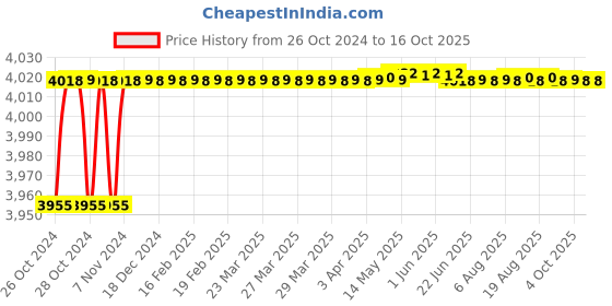 The current price is ₹4,018, which is ₹63 (1.6%) higher than the best price of ₹3,955 last seen on 26 Oct 2024. Over the 355 day price history period, prices have ranged from ₹3,955 to ₹4,022, with an average of ₹4,015. The pricing has been quite stable with low volatility, with prices remaining relatively stable overall. In terms of recent activity, there have been 0 price changes this week, 1 this month, and 45 over the past year. If you need this product now, it's a reasonable time to buy as prices are stable, but you might want to monitor for potential better deals.