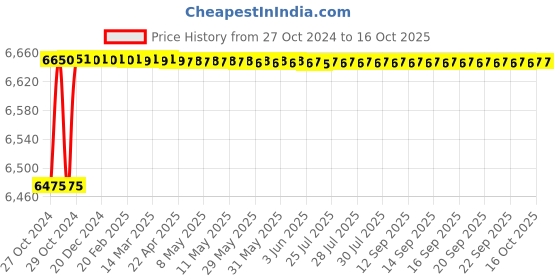 The current price is ₹6,647, which is ₹172 (2.7%) higher than the best price of ₹6,475 last seen on 27 Oct 2024. Over the 354 day price history period, prices have ranged from ₹6,475 to ₹6,651, with an average of ₹6,642. The pricing has been quite stable with low volatility, with prices remaining relatively stable overall. In terms of recent activity, there have been 0 price changes this week, 7 this month, and 56 over the past year. If you need this product now, it's a reasonable time to buy as prices are stable, but you might want to monitor for potential better deals.