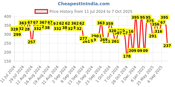 The current price is ₹237, which is ₹59 (33.1%) higher than the best price of ₹178 last seen on 26 Oct 2024. Over the 453 day price history period, prices have ranged from ₹178 to ₹395, with an average of ₹320. The pricing shows high volatility with significant fluctuations, and the overall trend is favorable for consumers as prices are getting cheaper. In terms of recent activity, there have been 0 price changes this week, 0 this month, and 15 over the past year. This is an excellent time to make a purchase as prices are trending downward and conditions appear favorable.